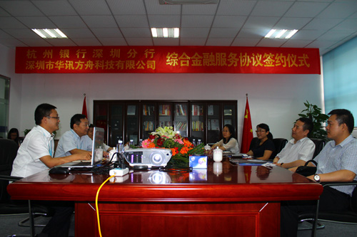 7月25日,杭州銀行深圳分行與華訊方舟的綜合金融服務(wù)協(xié)議簽約儀式在集團(tuán)總部舉行,杭州銀行深圳分行行長(zhǎng)冷文廣及其代表,華訊方舟總裁黃永江、副總裁Sunny等領(lǐng)導(dǎo)共同出席了簽
